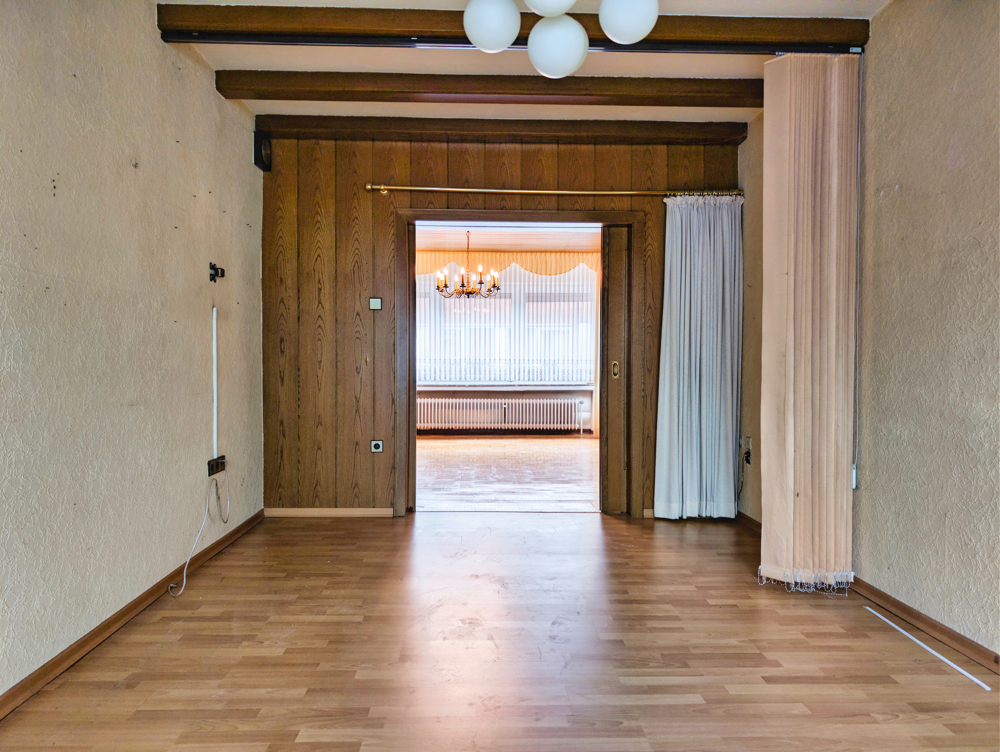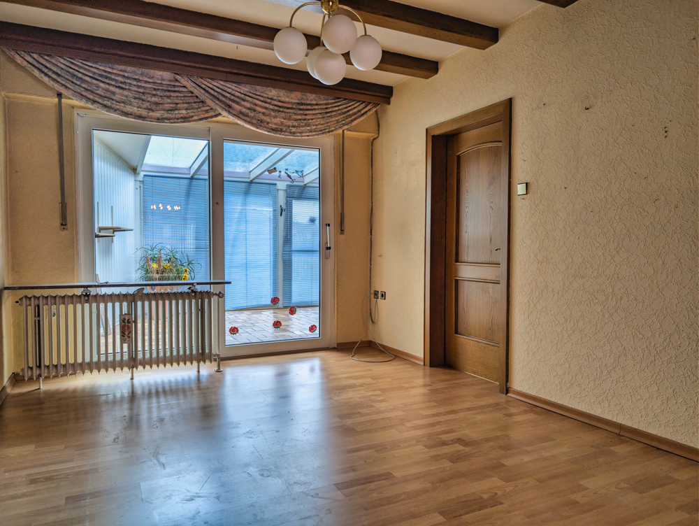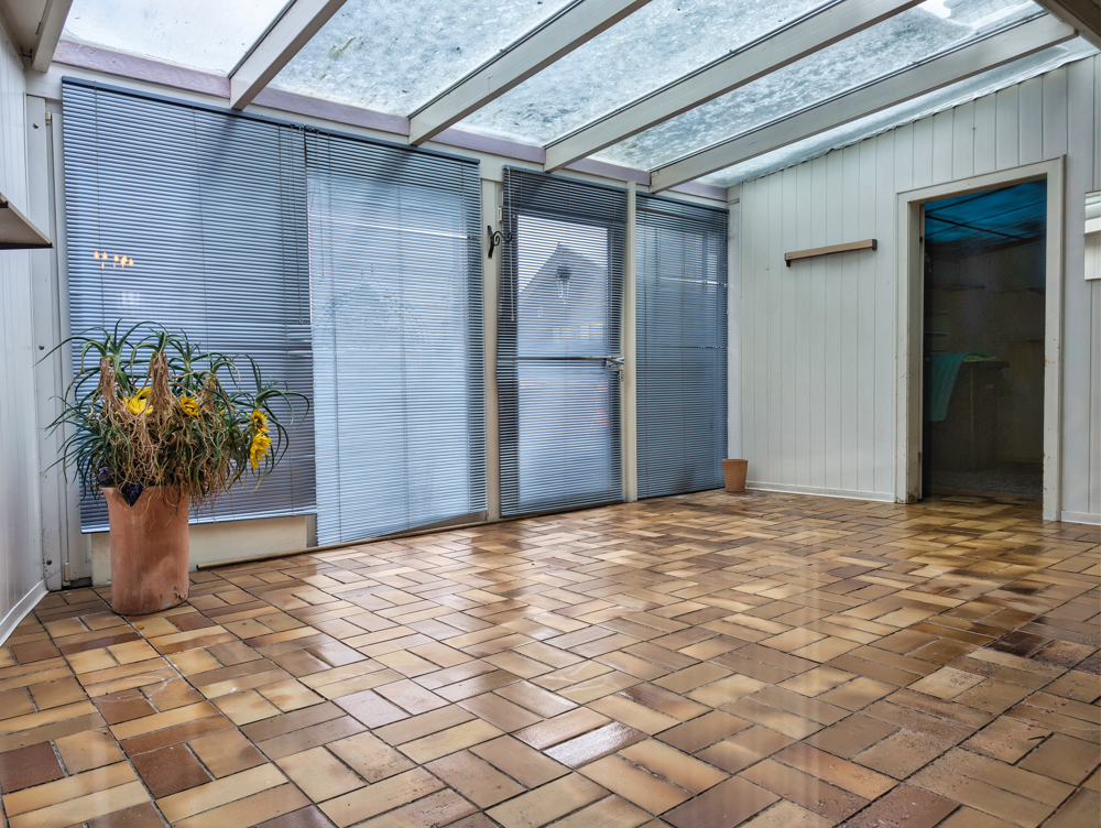 Der Essbereich begeistert mit sichtbaren Holzbalken und schafft eine warme, einladende Atmosphäre. Zusätzlichen Komfort bieten der geflieste Wintergarten, ein pflegeleichter Garten mit Terrasse sowie ein separates Gartenhaus – ideal zum Entspannen oder für Hobbyzwecke.